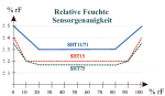 Na załączonym wykresie dokładność sensorów przeważnie stosowanych w stacjach pogody. Jak widać dokładność pomiaru wilgotności jest największa w zakresie od 20% do 80%, a dla lepszych sensorów w zakresie 10%-90%. Powyżej i poniżej tych wartości niedokładność drastycznie wzrasta. Na kolejnym wykresie zalecenia normalnej pracy dla sensorów SHT7x. Z tego co wyczytałem w dokumentacji, wynika że długoterminowa ekspozycja sensorów SHT7x (ponad 60h) poza normalny zakres pracy, zwłaszcza w wilgotności powyżej 80% może czasowo zawyżyć wilgotność o +3%.